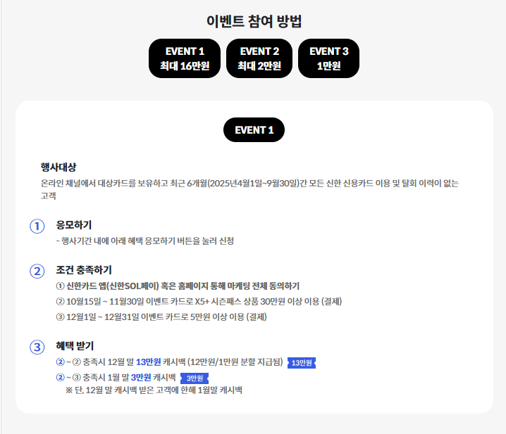 혜택: 12월 말 13만원(12만+1만 분할), 1월 말 3만원 추가 캐시백 (12월 수령 고객 한정)
